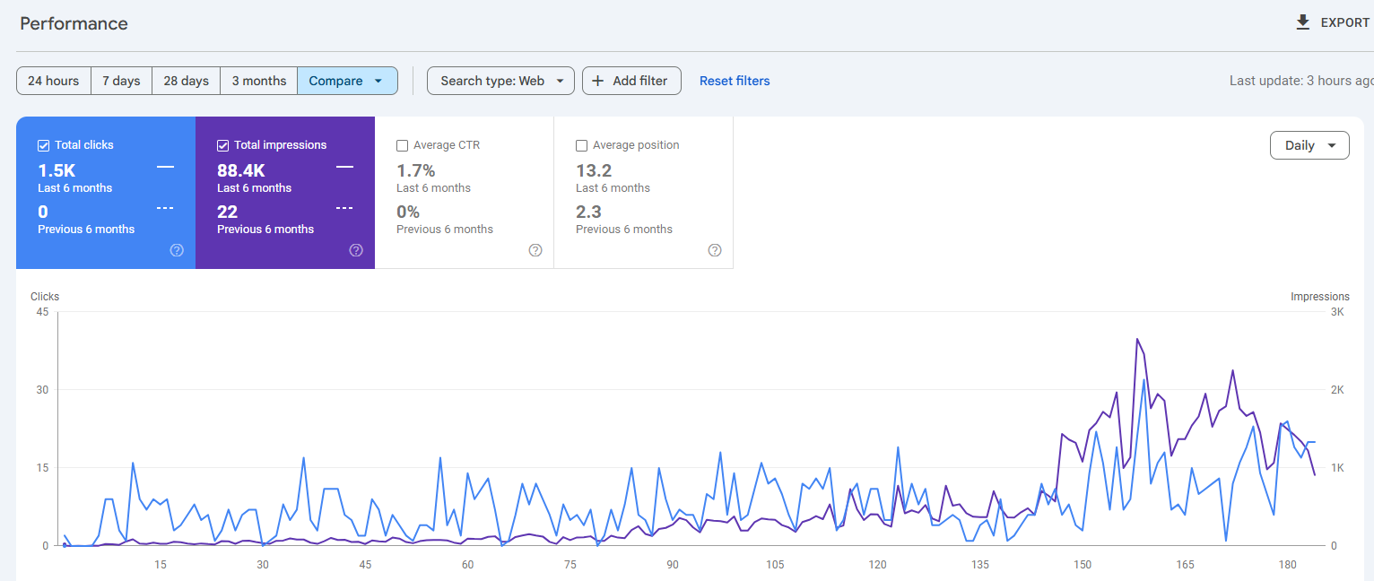 Because of this, the site had almost no impressions and no organic clicks.